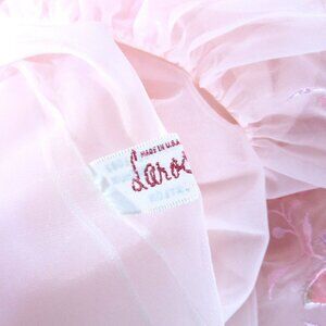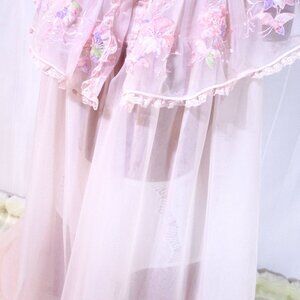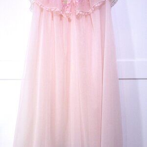 Exquisitely feminine double nylon nightgown by Laros, circa late 50s or 60s. The highlight is a gorgeous yoke...a layer of embroidered lace at the shoulders and neck. Two layers of sheer pink silky soft nylon. It's tagged medium but fits generously, measuring up to 22.5 inches underarm to underarm, so I think it's probably good for a medium or large fit, perhaps best for someone with up to a 38 inch chest. Length is 40 inches from top of shoulder to hem. This nightgown is in excellent vintage condition. Panties not included.