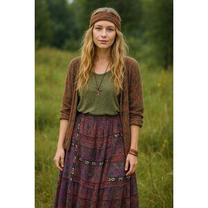 The vintage ladies skirt in a boho hippy style is a unique and eye-catching piece of women's vintage clothing. With a flowing design and a relaxed fit, this skirt embodies the laid-back, carefree spirit of the hippy era. Made from comfortable and breathable fabrics, this large-sized skirt is perfect for those looking to add a touch of retro charm to their wardrobe. Ideal for casual outings or adding a vintage flair to a bohemian-inspired outfit, this skirt is sure to stand out and make a statement.