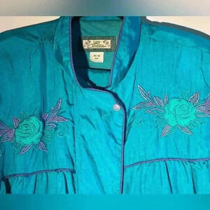 Vintage 'Lady Footlocker Casuals' matching tracksuit with florals embroidery, shoulder pads, and matching track pants with elastic tie waistband. Both the jacket and pants have pockets. Electric teal in colour (despite pictures making it look blue) with purple floral details.