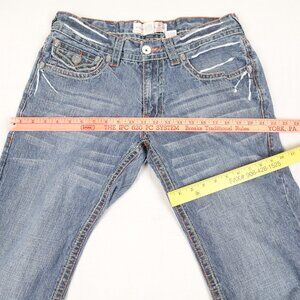 Metal skulls and pocket embroidery. Great condition, light wear, light distressing, one small hole below right pocket, small spot on left side - see last photo. Tag size 34, measures 36x34 - see measurements in photos.