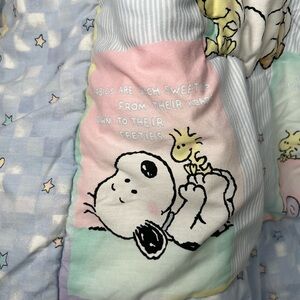 Lambs & Ivy My Little Snoopy baby crib comforter & diaper caddy set. Beautiful light blue and multicolour pattern. Various Baby Snoopy sayings throughout. Absolutely stunning. No year listed but believe this is mid - late 90s.