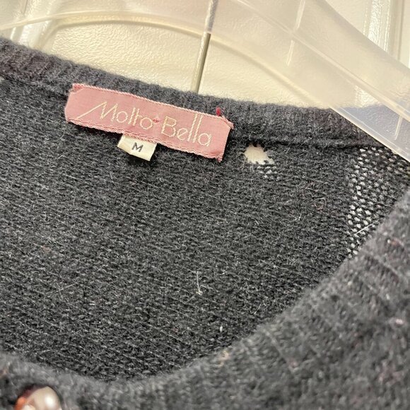 This elegant vintage cardigan by Molto Bella features a luxurious blend of lambswool and angora, offering both warmth and softness. Embellished with intricate beaded embroidery and 3D floral appliqués at the shoulders, it’s finished with crystal buttons down the front for a timeless, feminine look.