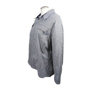 Vintage Lana Sport Plus Size 20 Blazer Jacket for Women, featuring a classic fit and made of a cotton blend outer shell material. The jacket has a check pattern with button and zipper accents, a full zip closure, and long sleeves. It is a short jacket/coat length, perfect for any occasion such as travel, casual, workwear, or business. The vintage blazer has pockets and is suitable for all seasons, including winter, summer, fall, and spring.