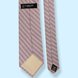 This vintage tie by Lanvin Paris is made of a silk/cotton blend (40/60) and features a diagonal stripe pattern in pink and purple tones. The interior fabric is off-white. There is a small tag on the thin end listing material contents, and a maker's tag stitched horizontally across the back of the thicker end. There is normal vintage wear, but no issues affecting wearability.