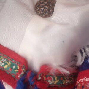Doll is wearing authentic handmade felt costume - blue dress with red accents & decorative trim.