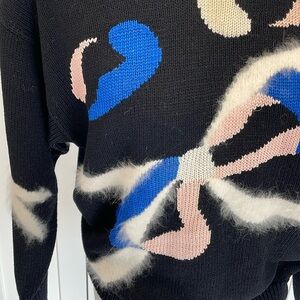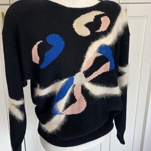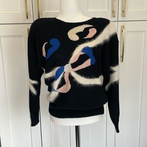Vintage Lara Ferrante black knit sweater with pink blue and white cat/bow pattern. The white portion of the bow detail has angora rabbit fur on the front and arms of the sweater, this sweater does have shoulder pads as well but can probably be cut out/removed if you like. 56% Acrylic, 38 % rayon, 4% angora rabbit fur, 2% nylon. Made in Hong Kong. Size Large. Good pre owned vintage condition with a few marks on the blue stitching, the tag has some discolouration as well. Please see photos, measurements are for reference only. Reasonable offers welcome!