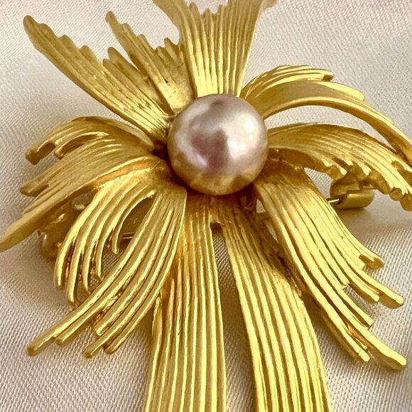 A gorgeous, large baroque-style brooch in shape of starburst, featuring brushed, textured metal and a faux pearl. Undated, looks 70s or 80s.