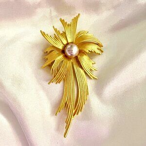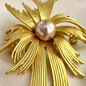 🧷Vintage Large Baroque-Style Starburst Brooch on Gold-Tone Metal - Faux Pearl