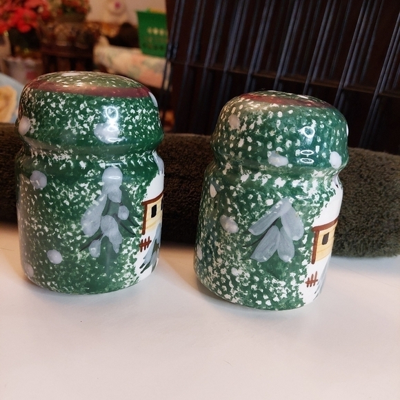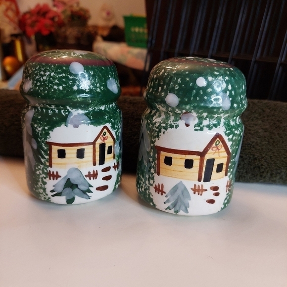 Vintage* Large Cottage in Forest Salt & Pepper Shakers. Hand-painted. Green forest with cottage scene. Stands 4" tall. 2 and 3 holes.* One stopper inside shaker; other missing. Guessing 80s. Pre-owned. No damage noticeable.