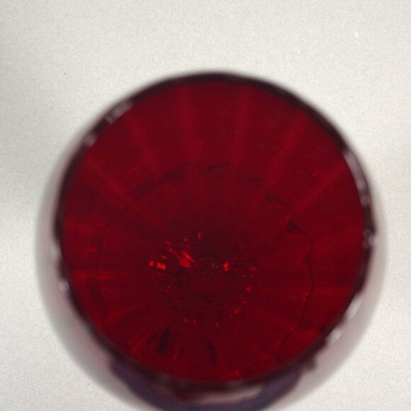 This large Empoli narrow snifter vase is deep red with a clear glass stem. It has a subtle ribbed texture with a scalloped top edge. The original Made in Italy sticker is still present.