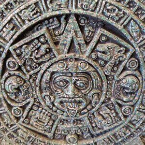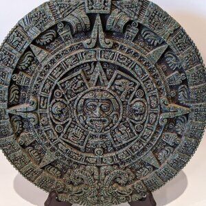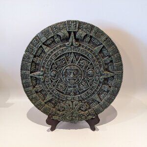 This Mayan calendar wall hanging has the look of stone/Malachite but is made from a resin composite. The back is covered with green velvet felt and has an attached hook for easy hanging. The Mayan (or Maya) calendar is a system of three interlacing calendars and almanacs which was used by several cultures in Central America, most famously the Maya civilization. The calendar in this posting is purely decorative. A unique home decor piece!