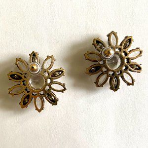 Bold statement stud earrings. Floral design with alternating clear/transparent and amber colour petals. Bronze-tone backing.