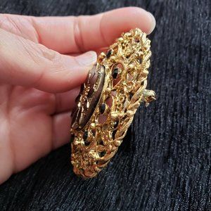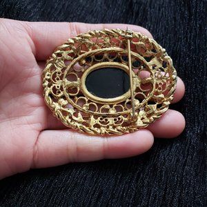 Vintage Large Oval Gold Tone Black Rhinestone Filigree Pin Brooch