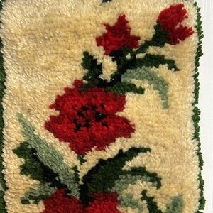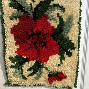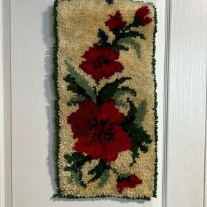 Vintage Latch Hook Rug Wall Art, red florals, Woven Fibre Wall Hanging