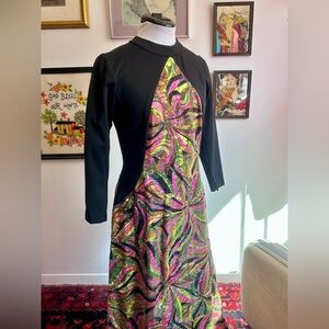 Bold, sculptural, and seriously groovy. This late 60s or early 70s gown is a showpiece of psychedelic evening wear. The body-hugging black stretch crepe bodice gives way to a dramatic contrast panel in a metallic, flocked swirl print thatโs pure space-age opulence.