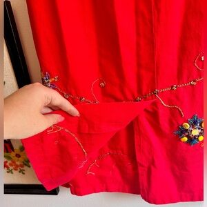 This late 90s/Y2K red shift dress captures the playful, global-inspired style of the era with its bright color and intricate embellishments. Made from a lightweight woven cotton or cotton-blend fabric, it features a classic sleeveless scoop-neck silhouette with hand-applied beaded floral embroidery across the hem and neckline — full of texture, color, and charm.