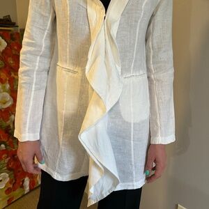 This vintage Lauren Vidal white linen jacket has ruffle detailing down the front. Hook and eye clasps are used to keep the jacket closed. Size S . Fit like a 4/6 US