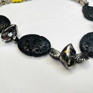 A striking vintage necklace featuring large natural lava rock pieces paired with smoky glass beads and sculptural metal accents. The dramatic contrast of textures — porous volcanic stone, glossy glass, and polished metal — creates a bold and contemporary look while still rooted in 1980s design aesthetics. Finished with a convenient magnetic clasp.