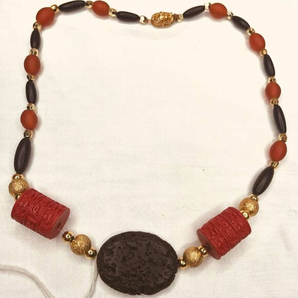 Striking vintage necklace featuring a bold central lava stone element, accented with Tibetan-style carved beads, glass beads, and metal details.