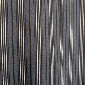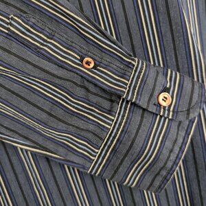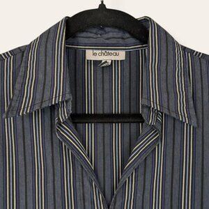 This vintage shirt by Le Chateau is made of a cotton/nylon/spandex blend (65/30/5) and has long sleeves with a dark stripe pattern in grey, blue, yellow, and black. The shirt has buttoned sleeve cuffs and a standard collar but is a tunic-style shirt with a v neckline and no button front. The bottom seems to be a little longer than standard and there is a slit on either side to help with movement. There is normal wear, but no issues affecting wearability.