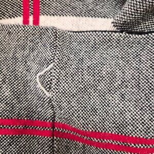 Vintage Le Château hooded cardigan in a classic plaid/tartan pattern featuring tones of grey, black, white, and red. Open front design with no buttons, two front pockets, and a built-in hood. Medium-weight knit with soft drape, suitable for layering in cooler weather.