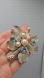 This pretty vintage brooch has a lovely leaf design with a faux pearl and sparkling Aurora Borealis rhinestones.
