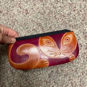 Vintage Leather Cat embossed zip top Pouch/glasses case