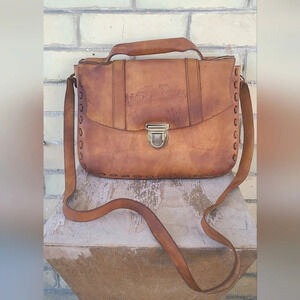 Beautiful hand crafted leather bag with etched farm scene on front.