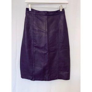Leather high waisted pencil skirt in purple. Knee length with back split. Back zipper and snap button closure.