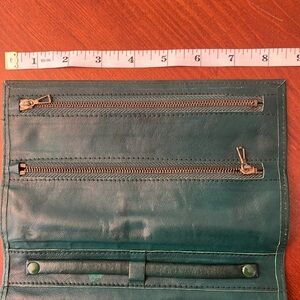 Very nice Vintage Green Leather Jewelry Travel Case. Zippers and snaps all in good working order.