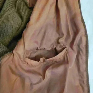 vintage leather and acrylic bomber-style sweater jacket. Featuring a unique mixed-material design, the front panels are crafted from genuine leather while the sleeves, back, and ribbed trim are a soft acrylic knit. A zip front closure with a stand collar and snap tab adds a classic touch.