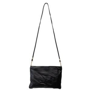 Vintage High Fashion Handbags leather crossbody bag in black with grey accent. Front features a diagonal knot detail. Top zipper with a single zip pocket inner. Gold toned hardware.