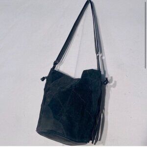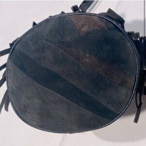 Vintage Leather Patchwork Black Brown Colour Block Bucket Bag Purse With Fringe