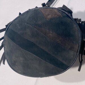 Vintage Leather Patchwork Black Brown Colour Block Bucket Bag Purse With Fringe