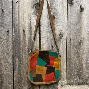 Featuring a mix of brown, red, green, and black patches, this bag exudes a funky retro vibe.