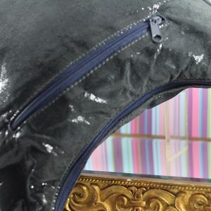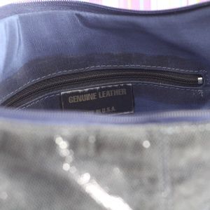 Leather is very soft, and very shimmery. Strap is leather and lucite - which gives it a pop - beaded zipper pull