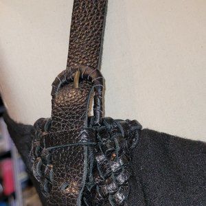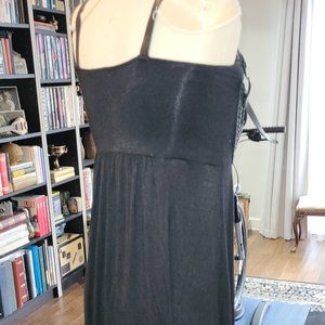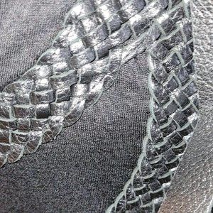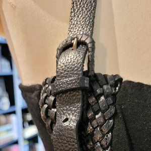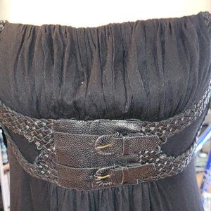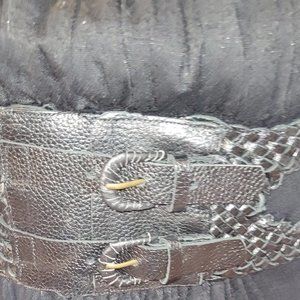 This is a very well kept and very gently worn handmade locally in Vancouver leather and rayon/poly/cotton dress. It is full length, and the material hangs really nicely. The bodice is a weaved leather, with 2 buckles that are adjustable. The shoulder straps are leather, with adjustable belt-like buckles. This is from a local artist and was purchased back in the late 90's or early 2000's.