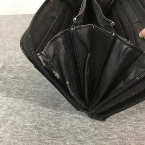 Smooth black leather wallet has several compartments plus a cheque folder. I believe this is a vintage Holt Renfrew wallet from when they used to have a house brand. Note: The detachable key fob is missing and there is some wear on one of the interior pocket folds (see photos). 8" by 4.25".