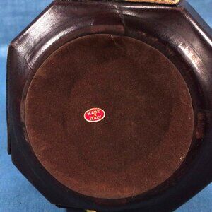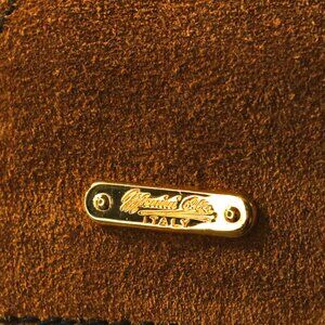 This is a vintage Italian decanter wrapped in leather with suede panels and gold toned metal accents. One of the metal accents is engraved with "Meuini Ole Italy." The bottom is felt covered and has a sticker: "Made in Italy." The stopper is also leather covered.