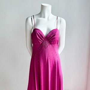 The dress exudes 1970s fashion with its elegant maxi style and rhinestone detailing.