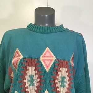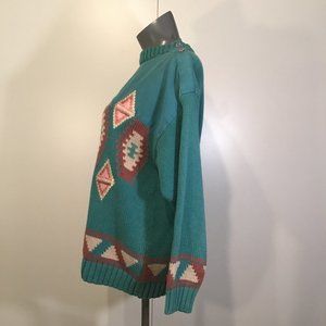 80s Throwback crew neck ski sweater in mint green with pink, cream and dusty rose accents and button details on the left shoulder.