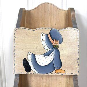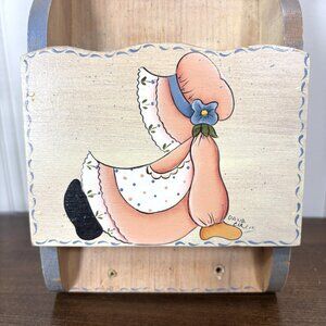 This vintage wall mail holder is hand painted with charming Sunbonnet Girl folk art, signed by artist Dana Cullis. It features two compartments for organizing letters, bills, or small notes while adding nostalgic farmhouse charm. The pastel tones and whimsical design make it versatile for use in the kitchen, craft room, office, entryway, or even as storage in a child’s room. Estimated era: 1970s–1980s.
