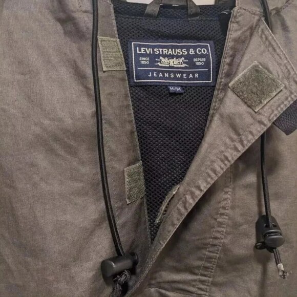 Vintage condition men’s size medium Levi Strauss & Co. Pullover Anorak in a nice Olive Green tan colour, has front pockets, with drawstring waist. All velcro.
