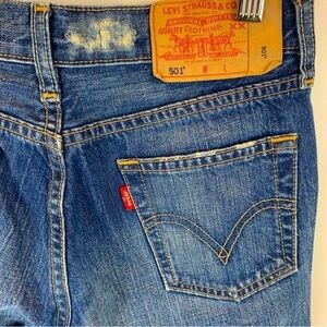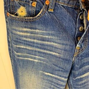 Fabulous 100% cotton vintage red tab Levi's 501 in great condition. Super stiff denim with no stretch. Manufactured distress and whiskering all over.