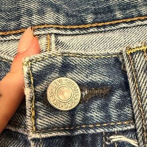 Stylish blue denim cutoff shorts with a distressed look. Levi’s 505 vintage made in the USA
