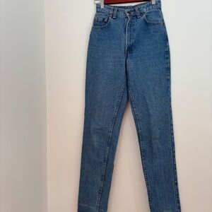 Super high rise vintage 531s made in Canada. Lovely mid blue in excellent condition with some whiskering at the ankle hem. Tapered leg. Small high back pockets make your butt look great! Marked 27, see measurements.