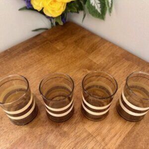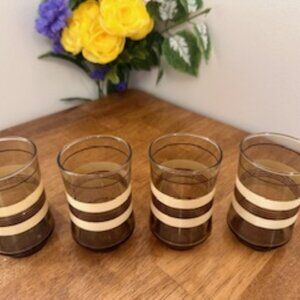 This stylish set of four vintage Libbey Bolero juice glasses features a smoky brown glass with bold cream and brown horizontal bands — a classic mid-century modern look. Perfectly sized for juice, cocktails, or retro table settings, these glasses add a warm, nostalgic vibe to any collection.