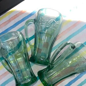 EUC these 3 beautiful Vintage Libbey Coca Cola Mugs will bring back fond memories, add a touch of retro charm and elevate your dining experience. Features the classic Coca Cola embossed trademark design, gorgeous green glass and sturdy handles. These mugs are perfect for serving your favorite beverages in style! Measurements approximately 6.5” tall with a 3.5” opening. No scratches, chips or cracks.