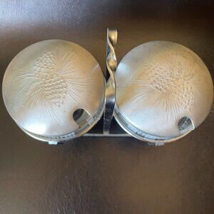 Selling a Vintage Libbey MCM Chrome Condiment Set: Glass Jars with Pine Cone Aluminum Lids. Fabulous Mid Century Modern chrome and glass serving caddy made by Libbey. This set has a sturdy chrome caddy with two glass containers with aluminum lids with embossed pinecone design. In wonderful vintage condition with no cracks, chips or breaks. The glasses feature black, white and gold Mid Century Modern graphics. The chrome carrier has a twist design in the handle.