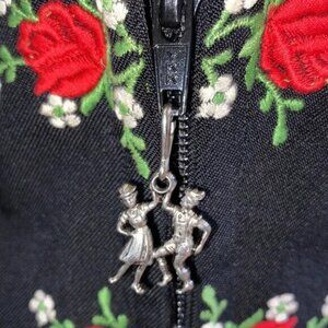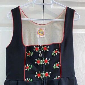 Vintage Licht Trachtenhaus Netherlands Holland National Costume Woman’s Jumper Dress Size 12. Front zipper YKK brand with charm pull. Black with red rose embroidery. Appears to have been altered or taken in. Wear at 1 corner of neckline- see pictures. Shows some normal wear. Approximate measurements: 18.5" armpit to armpit and waist 16.5" laying flat. 100% polyester. No care tag. Theatre, parade, Halloween, Folk, Square Dance, Dirndl, Bavarian, German, movie prop or wardrobe, Holland, Netherlands, festival, Oktoberfest, Celebration, Beer, 1960s to 1970s.